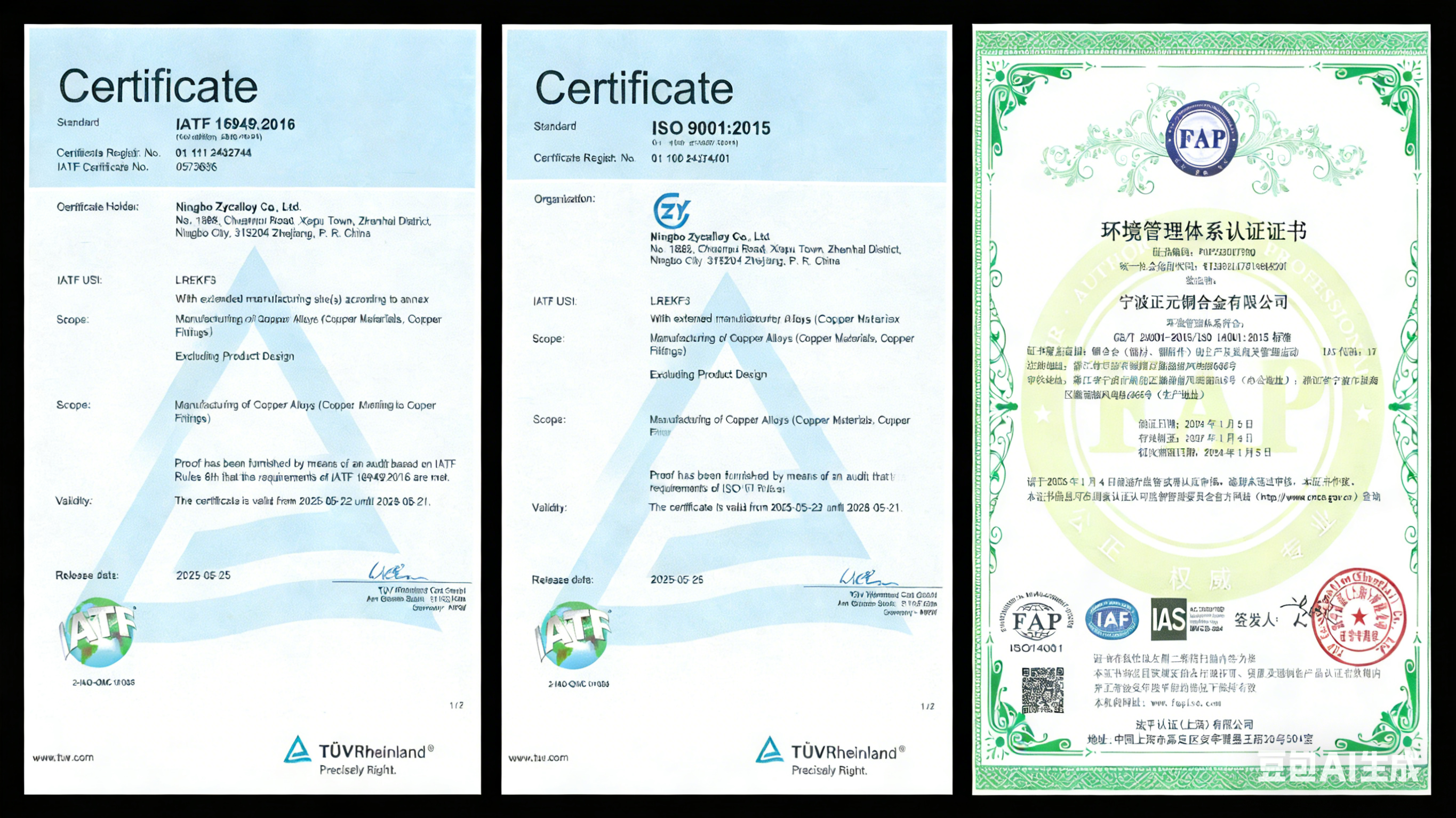 宁波正元合铜合金有限公司严格遵循ISO9001、IATF 16949与ISO14001体系标准,构建了从产品评审、生产制造到交付服务的全流程质量保障体系。凭借扎实的体系运行与持续稳定的产品表现,我们已成功进入多家国际客户的合格供应商名录,顺利通过多轮严苛审核,成为其供应链中值得信赖的一环。